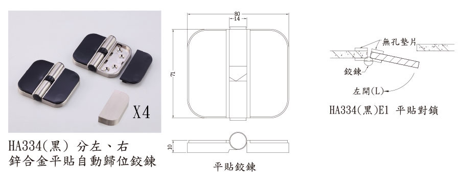 HA334(黑) 分左、右 鋅合金平貼自動歸位鉸鍊 。